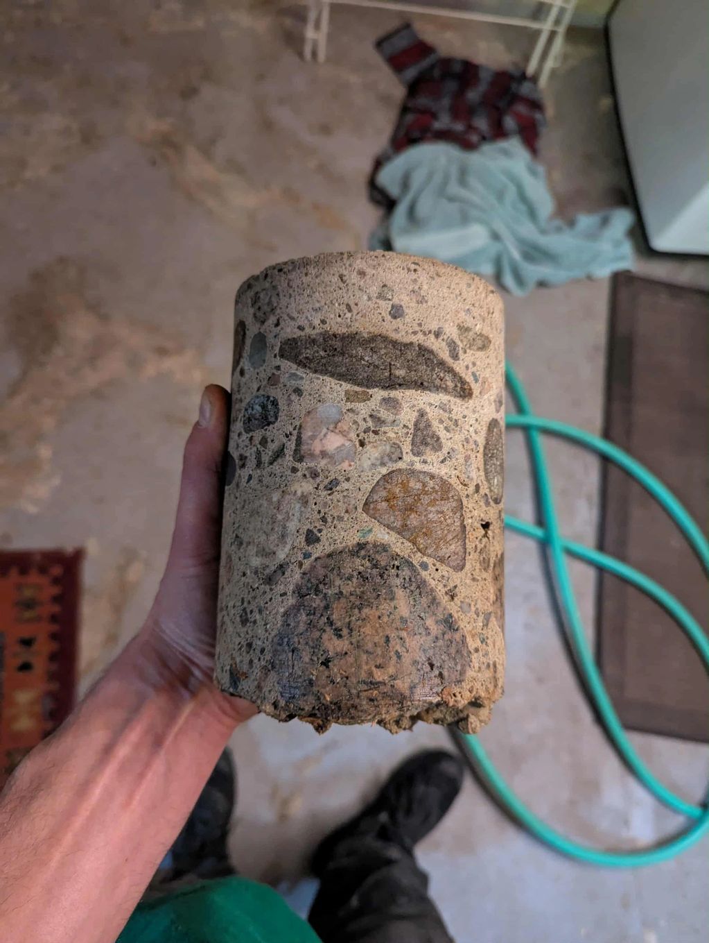 Concrete core removed during a radon mitigation project in the Kootenays, showing the precise drilling needed to install a radon reduction system.