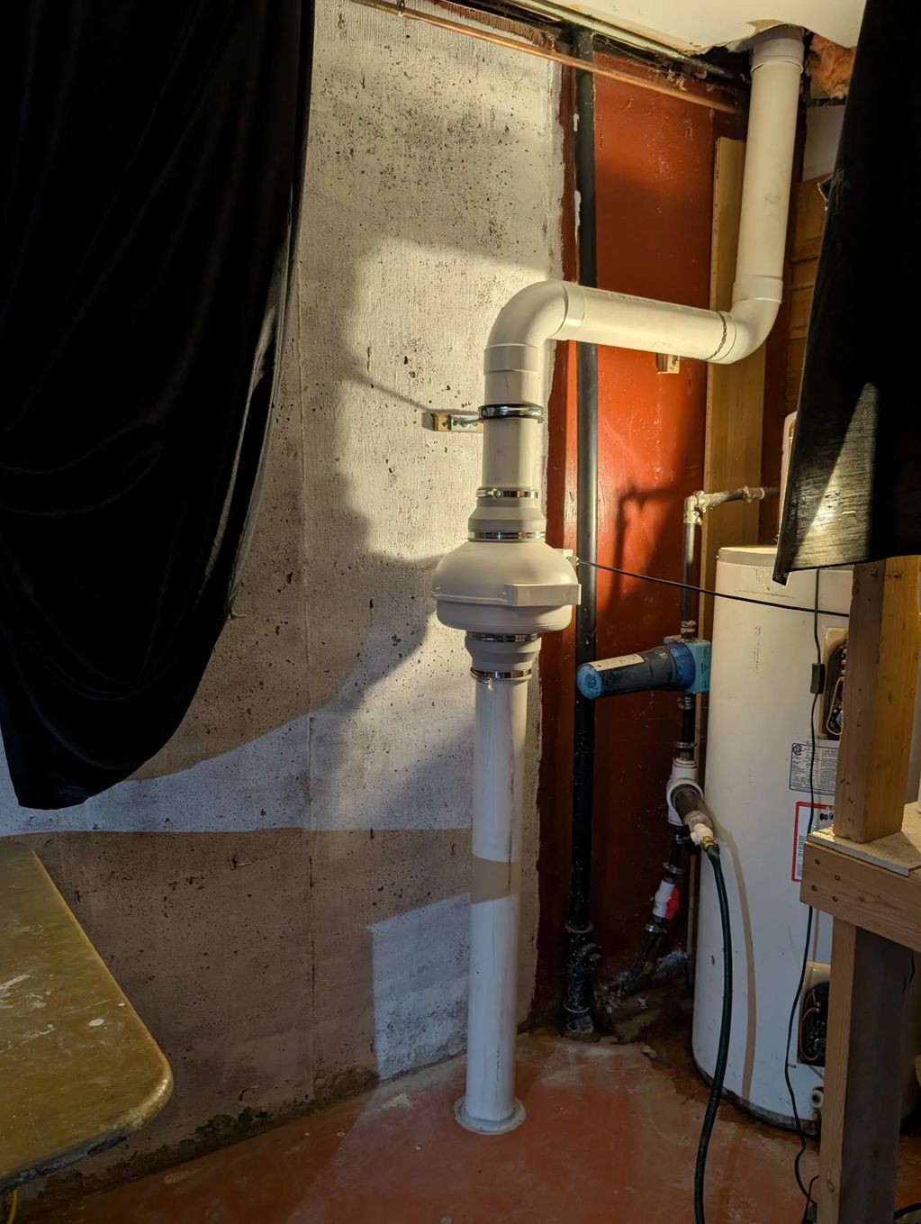 Radon mitigation system installed to reduce radon gas levels and protect indoor air quality. This setup uses sub-slab depressurization to draw radon from beneath the foundation and vent it safely outside, ensuring long-term protection for the home.